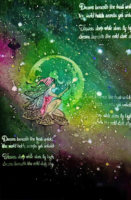 Her beautiful mystical form is complemented by fine details on the wings, tendrils and flowing hair beneath a long cap.